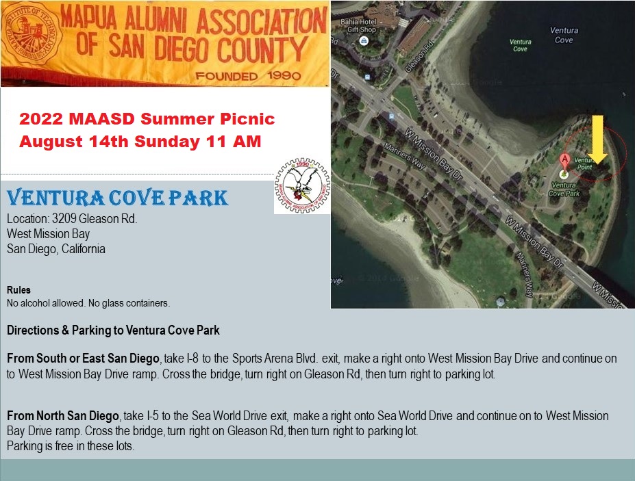 Mapua Alumni Association of San Diego Mapua Alumni and Friends Mission Bay Annual Summer Potluck Picnic Starts 11:30 AM Sunday - August 5th 2018 Directions West Mission Bay San Diego California